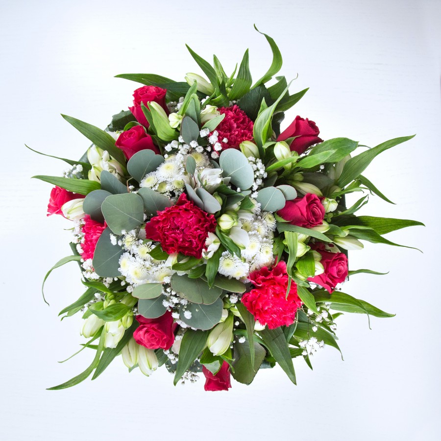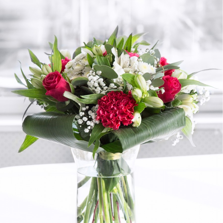 Add a splash of color with our Vibrant Elegance Bouquet. Featuring the rich red of roses and the purity of white chrysanthemums, complemented by the softness of gypsophila and the elegance of white alstroemeria and aspidistra leaves.